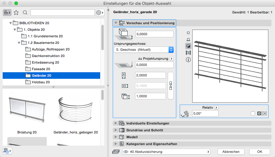 Die Wahl der Ebene entscheidet sich nach der Verwendungsart des Geländers: Als Teil einer Treppe liegt dieses auf 40 Stiege Rampe, als horizontales Geländer (z.B. Treppenhaus) auf der Ebene 40 Absturzsicherung.