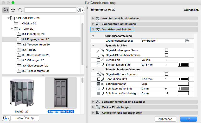 Im Bereich Grundriss und Schnitt können für die Tür die verschiedenen Grundrissdarstellungen eingestellt werden. Da die Tür mit der Darstellung einer Wand zusammenhängt wird hier in der Grundrissdarstellung Symbolisch eingestellt.