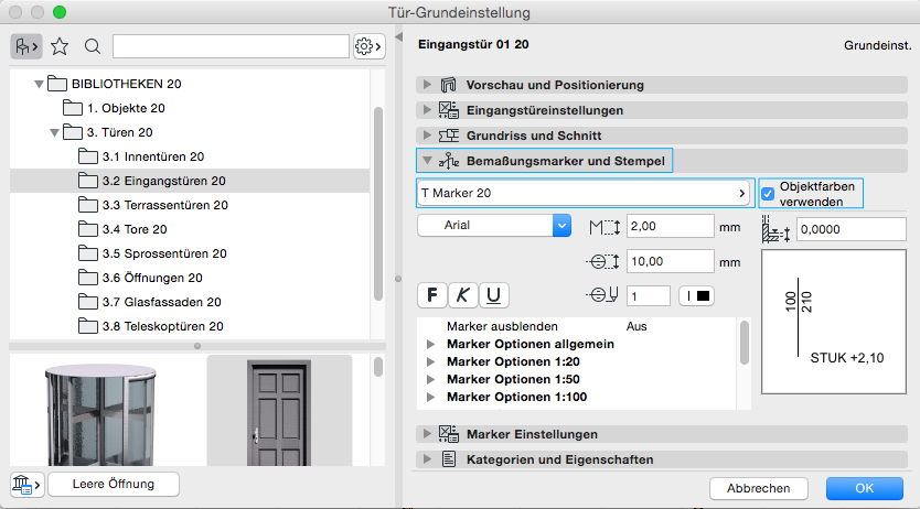 Wurde unter Bemaßungsmarker und Stempel der T Marker 20 eingestellt, finden sich hier die Einstellungen dazu.