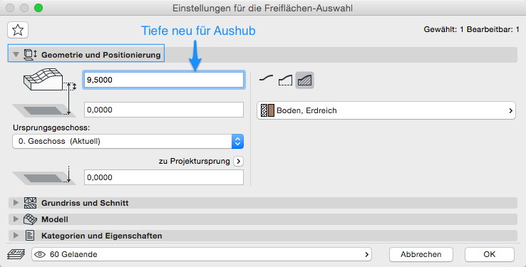 Eine weiterführende Anleitung zu Geländeaushub kann im Artikel Topografie erstellen und bearbeiten nachgelesen werden.