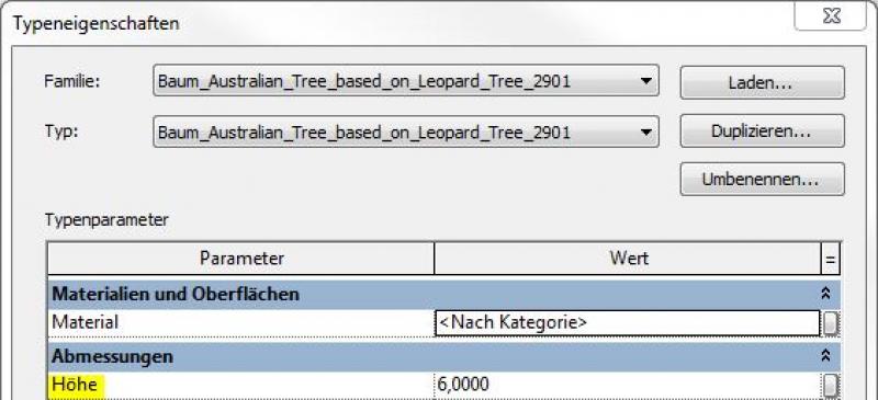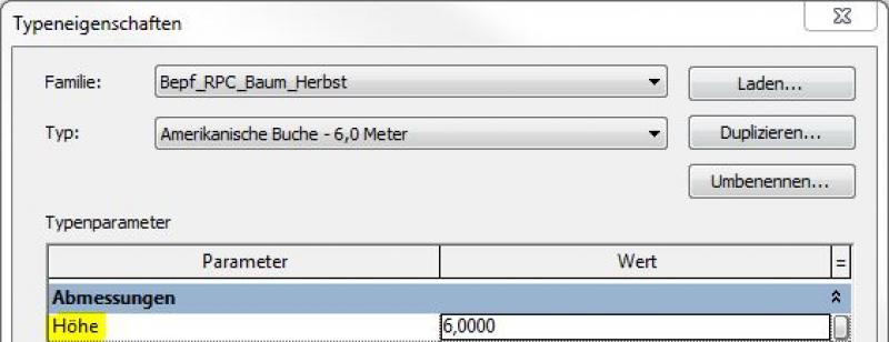 Wenn die Höhe von Bepflanzungen geändert werden soll, steht dafür in den meisten Fällen ein Typ-Parameter zur Verfügung: