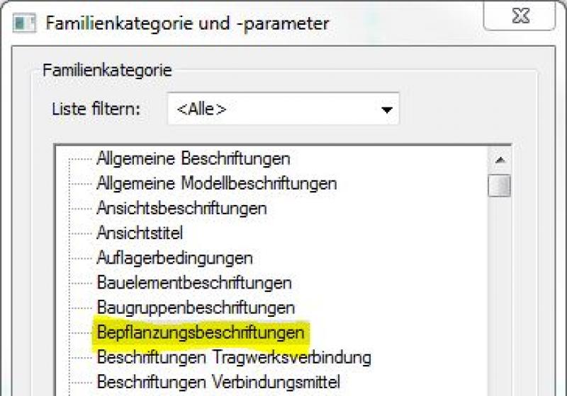 Bepflanzungsbeschriftungs-Familien können entweder aus dem Autodesk-Kontent entnommen oder eine neue Beschriftungs-Familien mit Vorlage M_Allgemeine Beschriftung, Änderung der Kategorie in Bepflanzungsbeschriftungen erstellt werden: