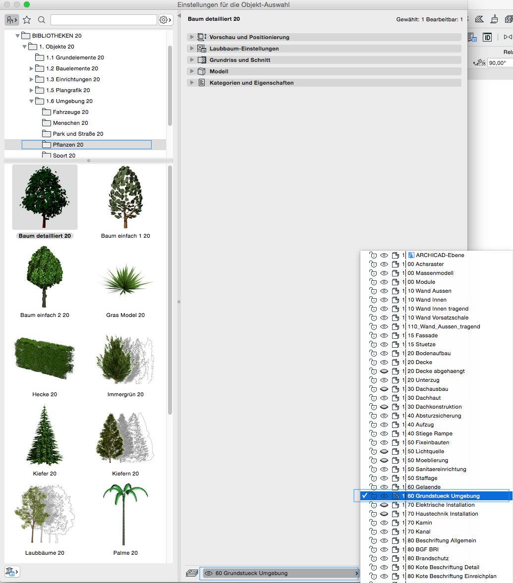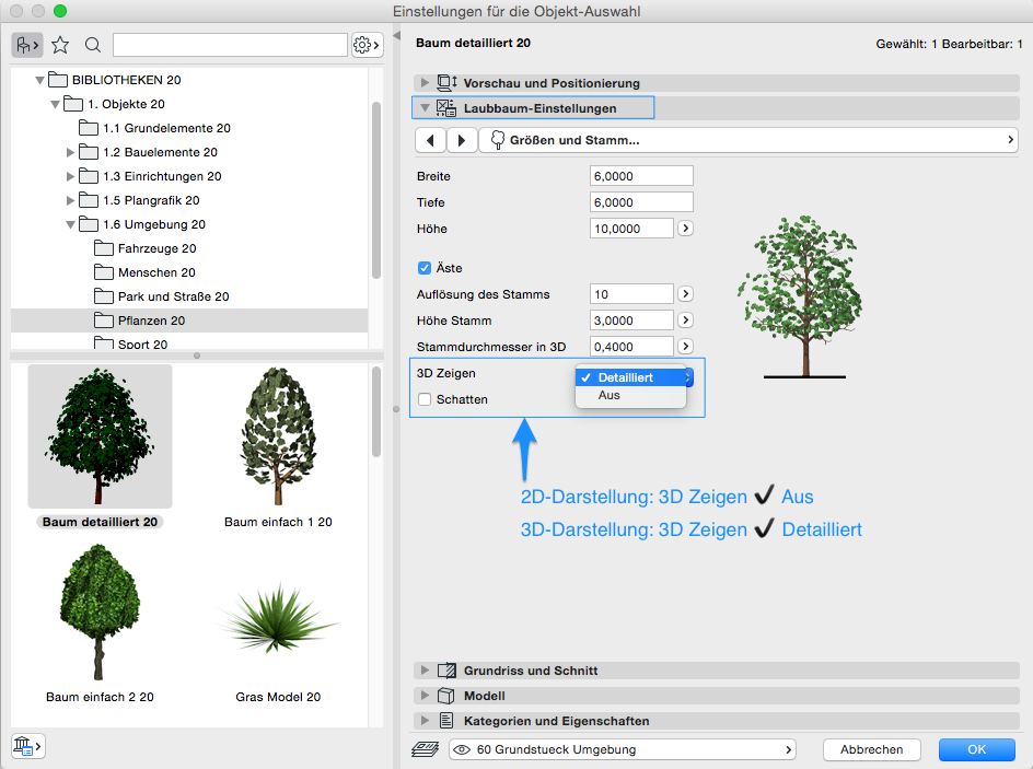Für Pflanzen-Objekte kann in den Einstellungen die 3D-Anzeige auf „Aus“ oder „Detailliert“ gesetzt werden – dadurch wird für ein Objekt die Wahl getroffen ob es als 2D-Symbol oder als 3D-Objekt platziert wird. Die Wahl auf 3D – Detailliert beinhaltet natürlich auch die 2D-Symboldarstellung für Grundrisse.