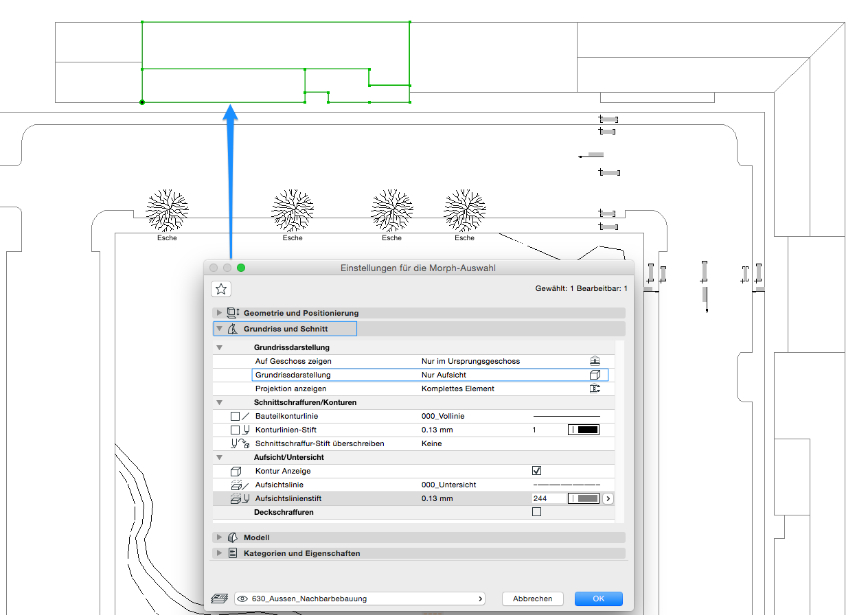 Die Systematik in ARCHICAD zur Beschriftung und Bemaßng von Nachbarbebauungen in den Grundrissen, Schnitten und Ansichten erfolgt (bis auf individuelle Texte) immer elementbezogen (adaptiv).
