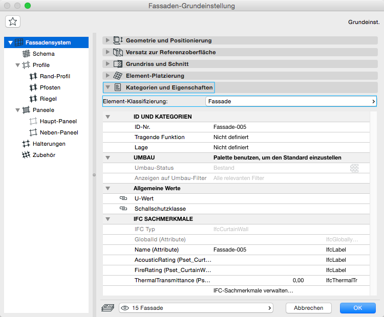 Unabhängig davon mit welcher Methode die Fassade erstellt wurde, wird in der Element-Klassifizierung die Einstellung Fassade getroffen. Durch die Wahl der Klassifizierung auf Fassade werden auch nur die Merkmale im unteren Feldbereich angezeigt, die für diese Klassifizierung laut ifc Sachmerkmale zur Verfügung stehen.