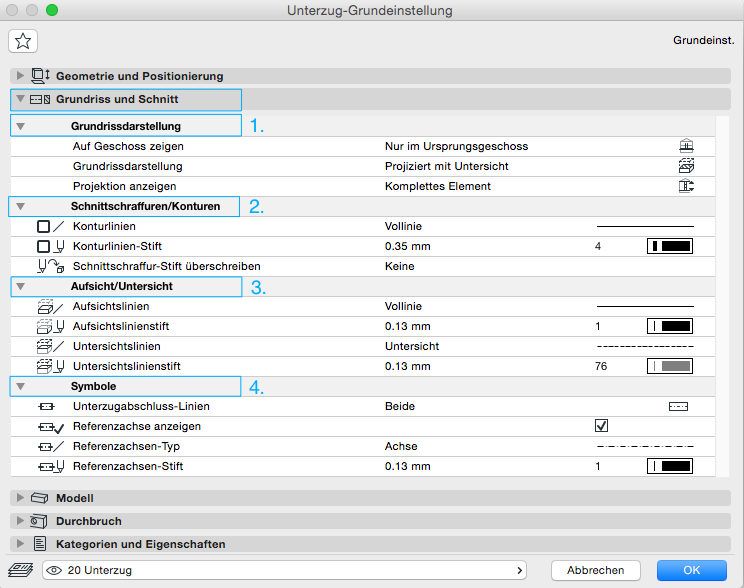 Im Bereich Grundriss und Schnitt ist unter 1. die normale Einstellung für die Grundrissdarstellung, dass der Unterzug Nur im Ursprungsgeschoss und Projiziert mit Untersicht dargestellt wird. Die Projektion sollte immer zum Grundrissbereich eingestellt werden, um auf Veränderungen der normalen Grundriss-Schnittebene in einzelnen Ausschnitt-Sets reagieren zu können.