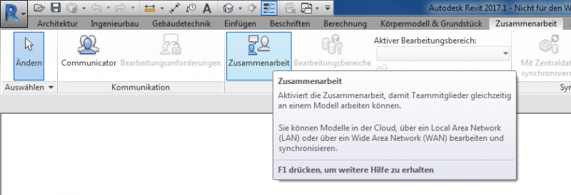 Bevor Bearbeitungsbereiche für die einzelnen Disziplinen angelegt werden können, sollte man im Reiter Zusammenarbeit den Modus Zusammenarbeit aktivieren.