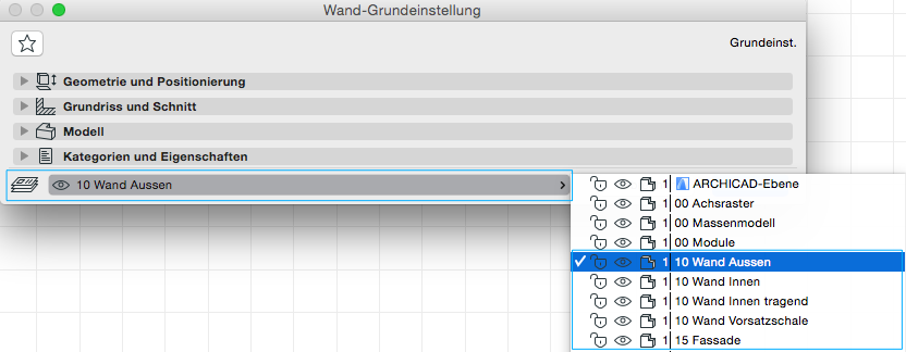 Zu Beginn ist die zu verwendende Ebene für die spezifische Wand-Nutzung zu wählen. Diese unterscheiden sich in 10 Außenwände, 10 Innenwände, 15 Fassaden und nach ihrer Tragstruktur oder speziellen Verwendung: