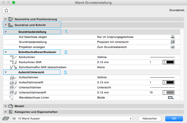 Im Bereich Grundriss und Schnitt ist die normale Einstellung für die Grundrissdarstellung, dass die Wand Nur im Ursprungsgeschoss und Projiziert mit Untersicht dargestellt wird. Die Projektion sollte immer zum Grundrissbereich eingestellt werden, um auf Veränderungen der normalen Grundriss-Schnittebene in einzelnen Ausschnitt-Sets reagieren zu können.