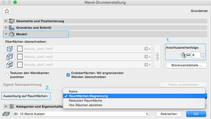Die 2. Grundeinstellung definiert die Struktur einer Wand (und damit ihre Stärke):