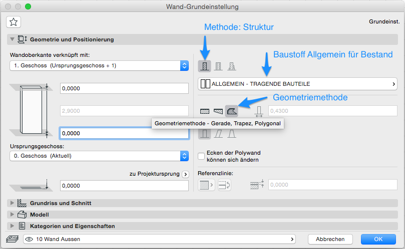 Für die Modellierung von Bestandswänden wird empfohlen die Geometriemethode Polygon zu verwenden:
