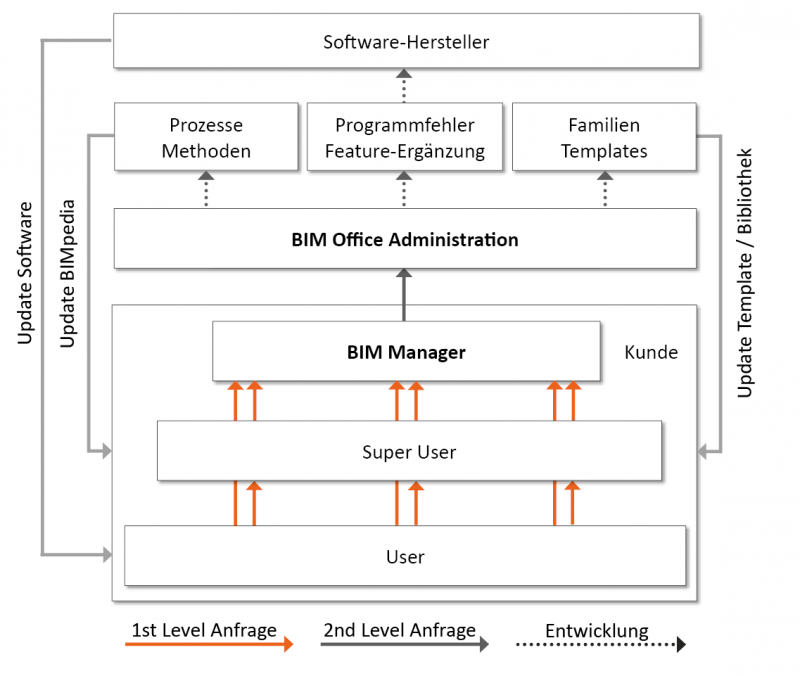 Betrieben wird die BOA durch die Plandata GmbH., die auch BIMpedia selbst betreibt. Die BOA wird von BIM-Administratoren geführt, die als Schnittstelle zu den BIM-Managern oder BIM–Verantwortlichen der einzelnen Kunden fungieren. Entwicklungsaufgaben werden von unseren BIM Administratoren im Netzwerk erhoben und intern an die Entwicklungsabteilungen verteilt, hier bearbeitet und anschließend wieder im Kundennetzwerk verteilt.