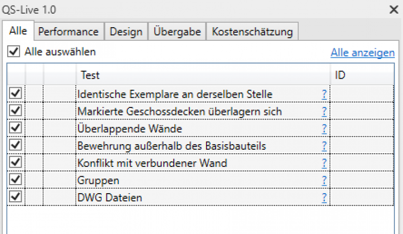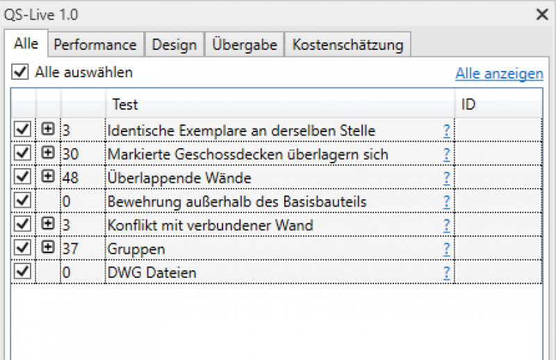 Der User hat die Option, alle Tests durchzuführen oder nur diejenigen, die er auswählt. Selbst bei einer großen Anzahl von Problemen im Modell sammelt das Tool die Informationen rasch.