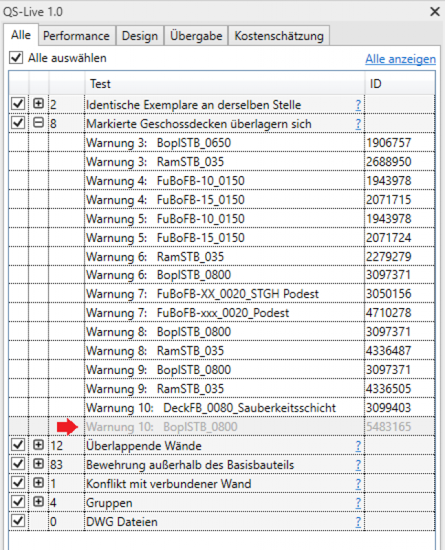 z.B.: Die Warnungsansicht listet in Revit alle Geschoßdecken auf, die Überlappungen haben. Das QS Live konzentriert sich zur besseren Übersicht nur auf die aktuelle Ansicht und kann in dieser nur jene Objekte anzeigen, welche auch in einem geöffneten Bearbeitungsbereich liegen.