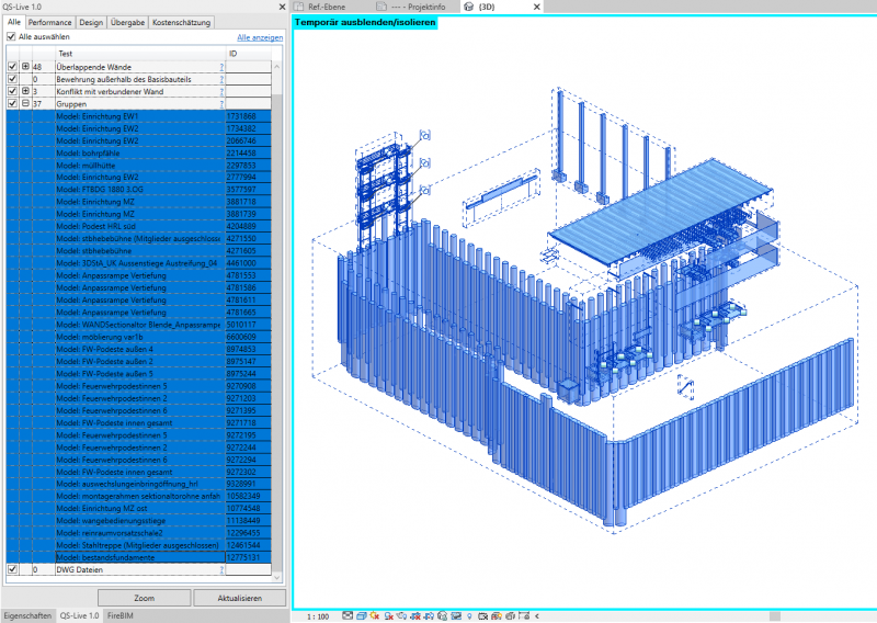 Das QS-Live Tool funktioniert in der 3D-Ansicht und der Plan-Ansicht. Elemente können in der 3D-Ansicht leichter gefunden werden, die verbunden Probleme können aber in der Planansicht besser behoben werden.
