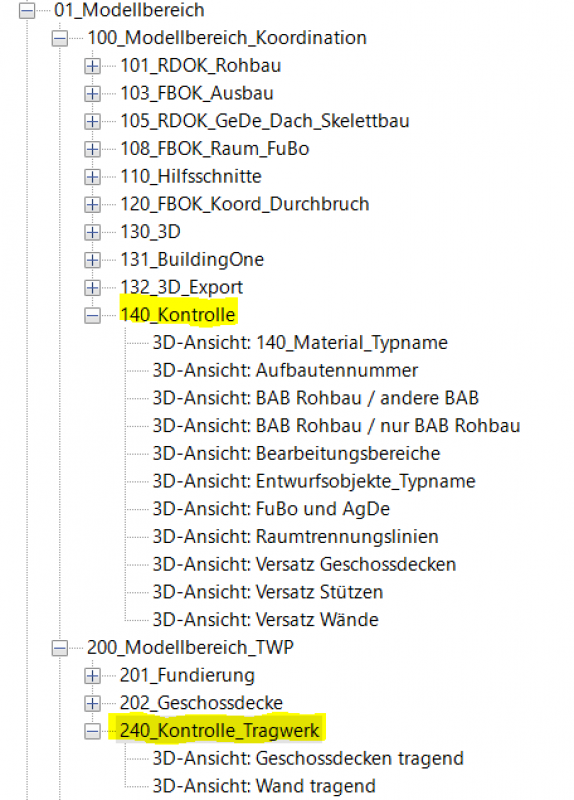 Die 3D Ansichten unter der Gliederung 140_Kontrolle und 240_Kontrolle_Tragwerk dienen als Unterstützung für die Modelprüfung und allgemeine Modelkontrolle. Die Sichtbarkeiten und graphische Darstellungen der Ansichten sind durch die optimierten Ansichtsvorlagen gesteuert. Die Sichtbarkeiten sind hauptsachlich durch das ein-/ausschalten der Modelkategorien, Filter und der Bearbeitungsbereiche gesteuert.