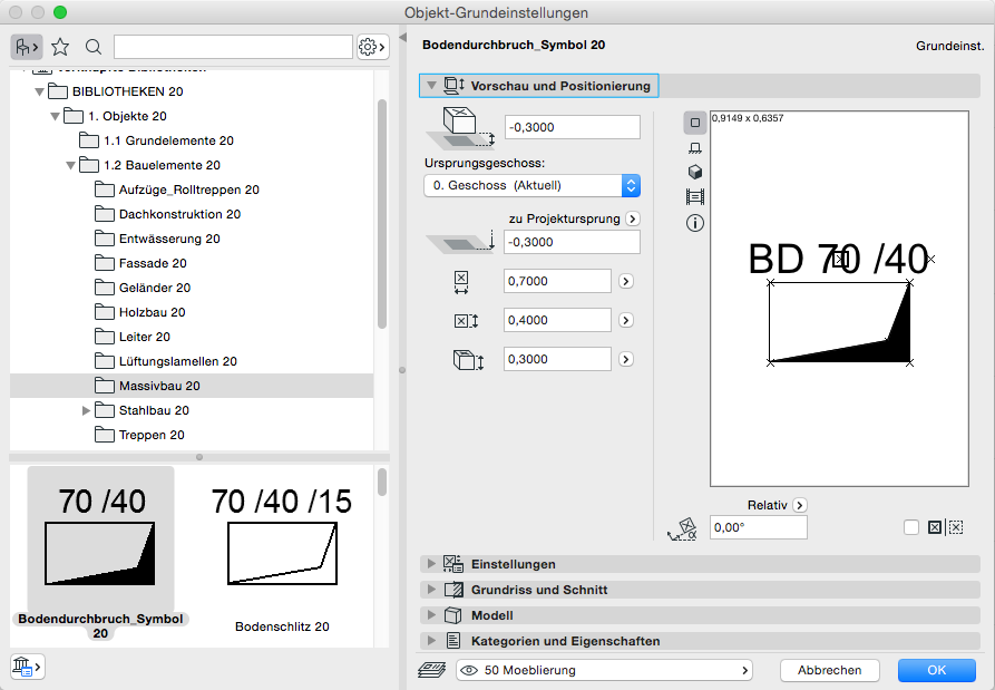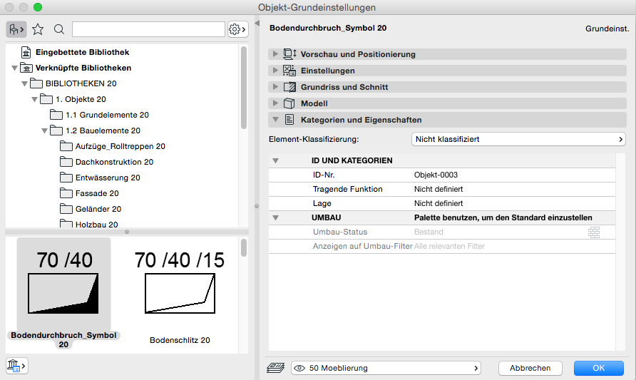 Der Boden-/Deckendurchbruch und Bodenschlitz befindet sich in den Objekten. Für die grundsätzliche Verwendung des Objekt-Werkzeuges verweisen wir auf die Basisdokumentation von Graphisoft im Help-Center.