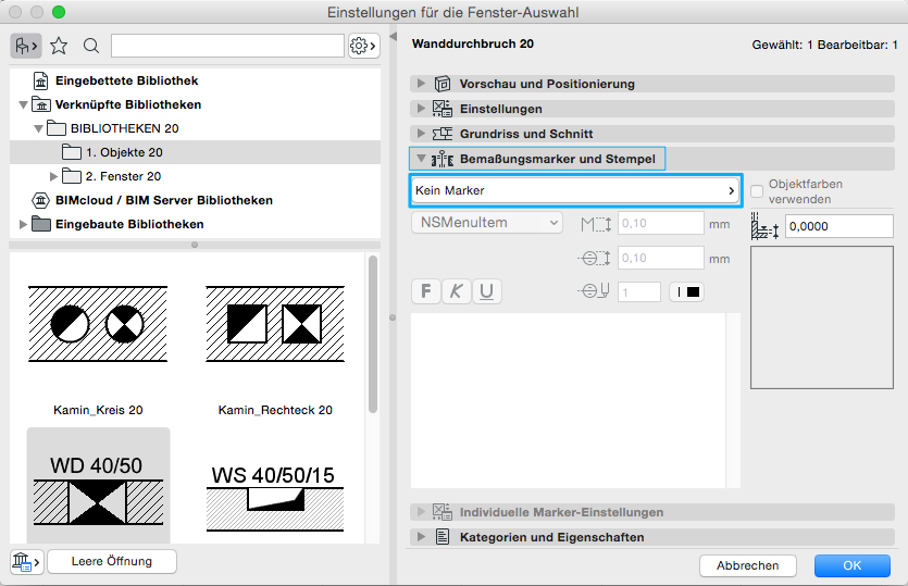 In der Fensterbibliothek finden sich in den Objekten die Kamine, Wanddurchbrüche bzw. Wandschlitze etc. Für die grundsätzliche Verwendung des Fenster-Werkzeuges verweisen wir auf die Basisdokumentation von Graphisoft im Help-Center.