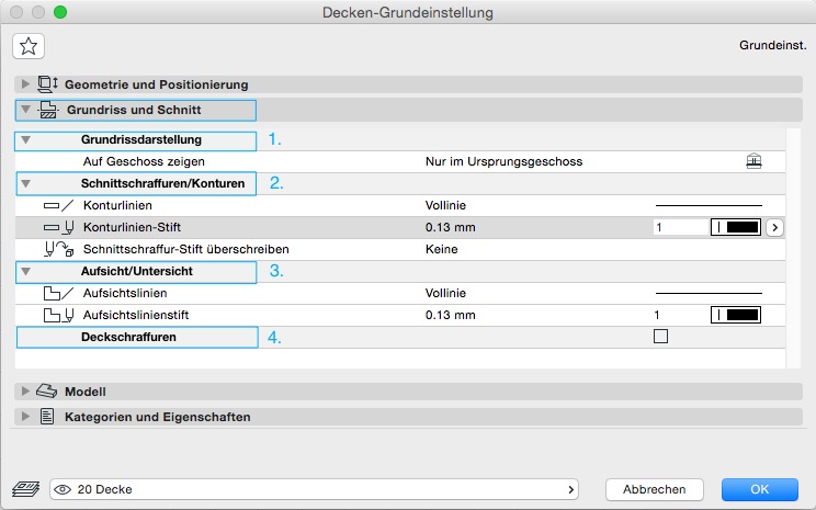 Im Bereich Grundriss und Schnitt ist die normale Einstellung für die Grundrissdarstellung, dass die Decke Nur im Ursprungsgeschoss dargestellt wird.