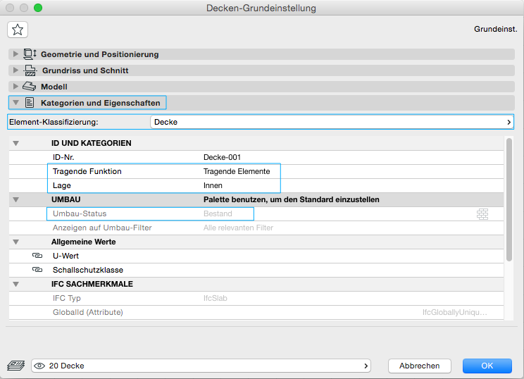 Die Element-Klassifizierung ist die erste Definition im Bereich Kategorien und Eigenschaften – s.a. Klassifizierung. Durch die Wahl der Klassifizierung auf Decke werden auch nur die Merkmale im unteren Feldbereich angezeigt, die für diese Klassifizierung laut ifc Sachmerkmale zur Verfügung stehen. Die Klassifizierung Decke gilt hierbei für tragende Decken, für Fußbodenaufbauten und Unterdämmungen wird die Klassifikation Bekleidung/Belag gewählt, und für Abgehängte Decken die Klassifizierung Abgehängte Decke.