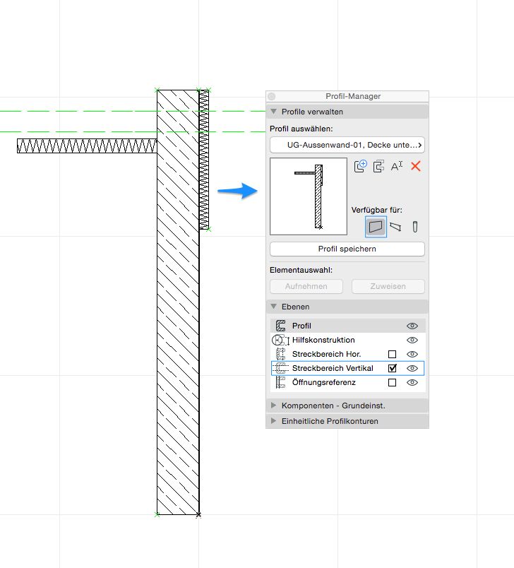 Die Verfügbarkeit wird auf Wand gestellt, da diese Art Aussenwand auch mit dem Wand-Werkzeug modelliert wird. Bei dem Profil ist darauf zu achten, dass ein Vertikaler Streckbereich eingestellt wird, um das modellierte Profil in seiner Höhe anpassen zu können.