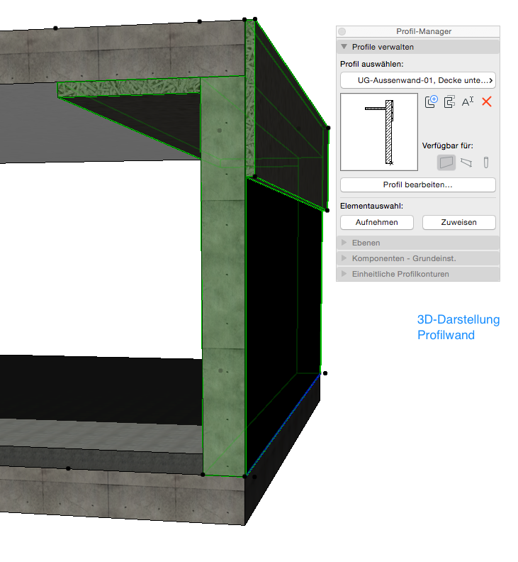 Eine Aussenwand im Untergeschoss besteht nicht nur aus mehreren Schichten, sondern auch aus verschieden gearteten seitlichen Abschlüssen - seitliche Perimeterdämmung (nicht über die vollständige Wandoberfläche) und seitliche Innendämmung gegen Decke über UG. Daher ist eine Modellierung nur mit einem Mehrschichtigen Bauteil nicht ausreichend, und die Strukturmethode Komplexes Profil kommt zum Einsatz: