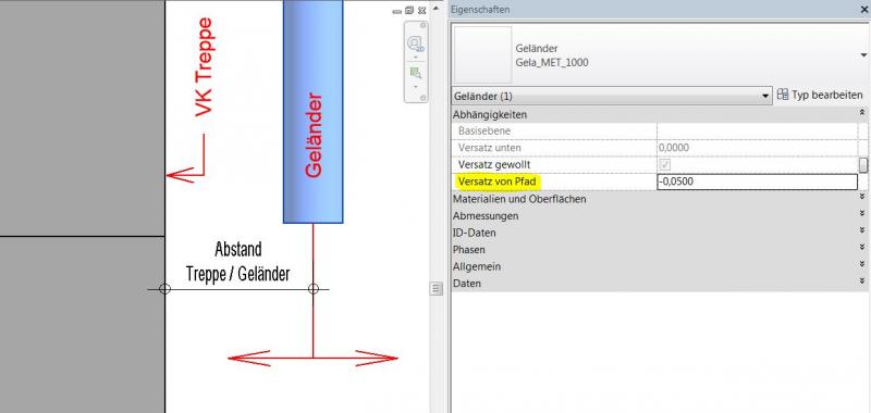 Der seitliche Versatz (Abstand des Geländers von der Treppe) wird hingegen über Exemplarparameter gesteuert.