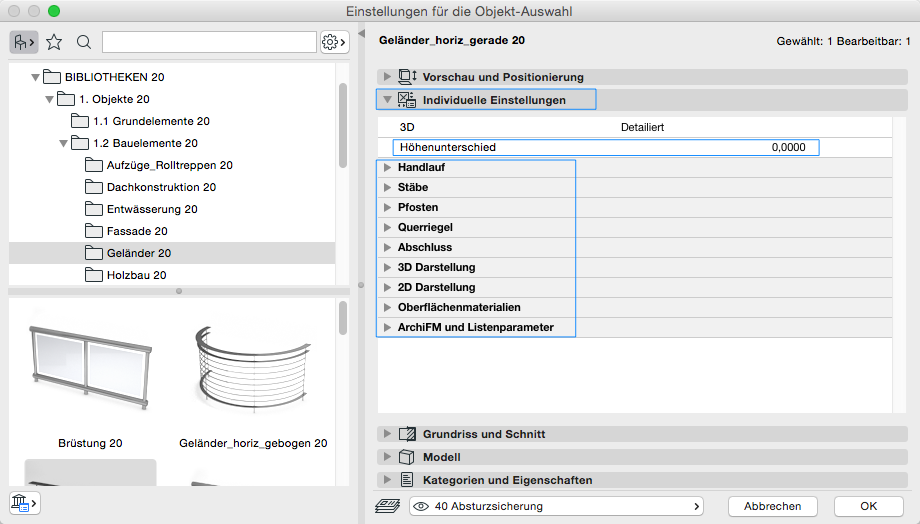 Die Wahl der Ebene entscheidet sich nach der Verwendungsart des Geländers: Als Teil einer Treppe liegt dieses auf 40 Stiege Rampe, als horizontales Geländer (z.B. Treppenhaus) auf der Ebene 40 Absturzsicherung.