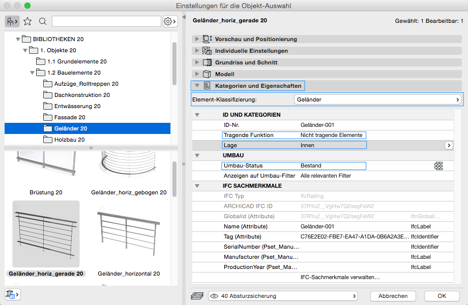 Die Element-Klassifizierung ist die erste Definition im Bereich Kategorien und Eigenschaften – s.a. Klassifizierung. Durch die Wahl der Klassifizierung auf Geländer werden auch nur die Merkmale im unteren Feldbereich angezeigt, die für diese Klassifizierung laut IFC Sachmerkmale zur Verfügung stehen.