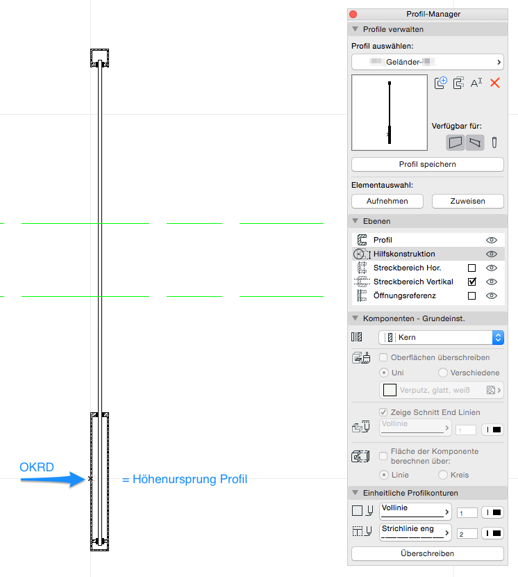 Für die Verwendung des Profil-Managers zur Erstellung eines Geländers gelten die Angaben für die Einstellungsdialoge des Wand-Werkzeuges, da ein Geländer-Profil mittels diesem modelliert wird.