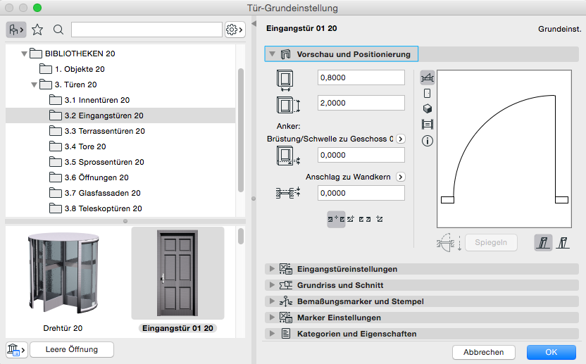 Die erste Registerkarte Vorschau und Positionierung zeigt die Grundmaße einer Tür - Breite/Höhe/Brüstung/Schwelle zu Geschoss/Anschlag können hier eingestellt werden. Die ausführlichen/spezifischen Einstellungen einer Tür befinden sich im nächsten Bereich des Menüs.