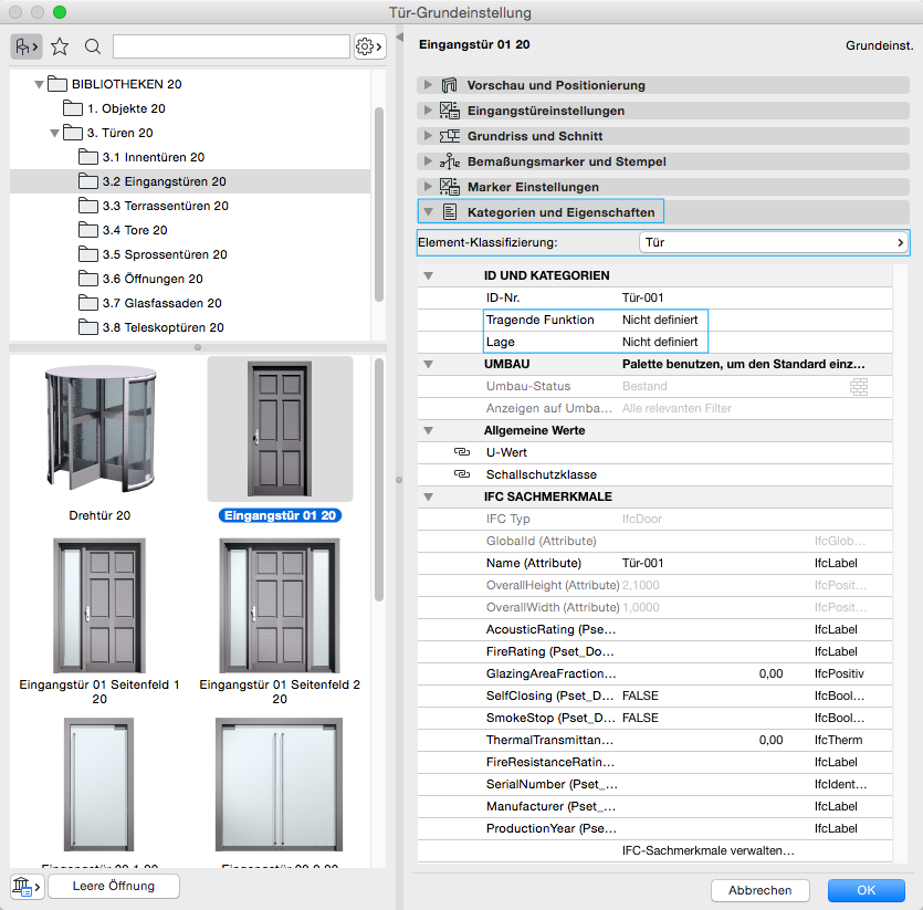 Die Element-Klassifizierung ist die erste Definition im Bereich Kategorien und Eigenschaften – s.a. Klassifizierung. Durch die Wahl der Klassifizierung auf Tür werden auch nur die Merkmale im unteren Feldbereich angezeigt, die für diese Klassifizierung laut ifc Sachmerkmale zur Verfügung stehen.