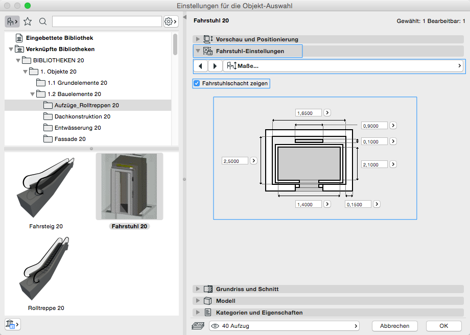 Für die grundsätzliche Verwendung des Bibliothekselementes Aufzug verweisen wir auf die Basisdokumentation von Graphisoft im Help-Center.