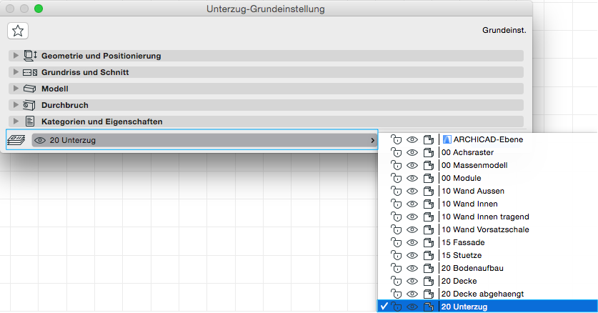 Zu Beginn ist die zu verwendende Ebene für den Unterzug zu wählen: