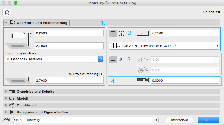 Die 1. Grundeinstellung in Geometrie und Positionierung betrifft die Positionierung des Unterzugs im Bezug zum Geschoss.