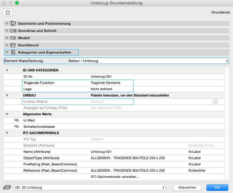 Die Element-Klassifizierung ist die erste Definition im Bereich Kategorien und Eigenschaften s.a. Klassifizierung. Durch die Wahl der Klassifizierung auf Balken/Unterzug werden auch nur die Merkmale im unteren Feldbereich angezeigt, die für diese Klassifizierung laut ifc Sachmerkmale zur Verfügung stehen.