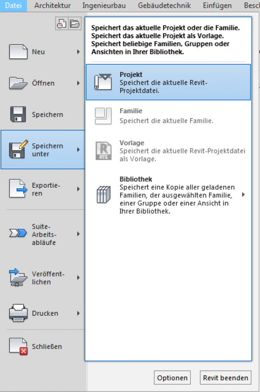 Unter Revit: Datei -> Speichern unter-> Projekt öffnet sich ein Explorer-Fenster: