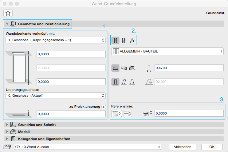 Die 3. Grundeinstellung ist die Wahl der Lager der Referenzlinie einer Wand. Bei tragenden Bauelementen ist dies die Vorderkante des tragenden Baustoffes (z.B. Stahlbeton) oder der Kernschicht im mehrschichtigen Bauteil.
