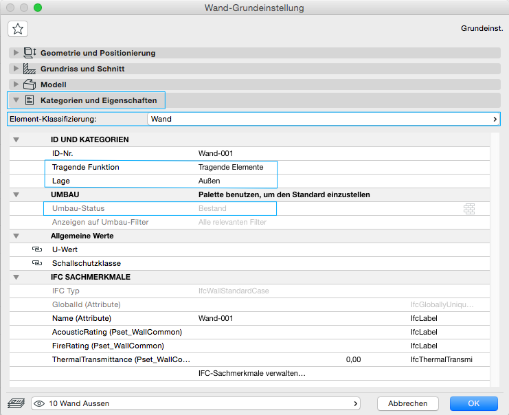 Die Element-Klassifizierung ist die erste Definition im Bereich Kategorien und Eigenschaften – s.a. Klassifizierung. Durch die Wahl der Klassifizierung auf Wand werden auch nur die Merkmale im unteren Feldbereich angezeigt, die für diese Klassifizierung laut ifc Sachmerkmale zur Verfügung stehen.