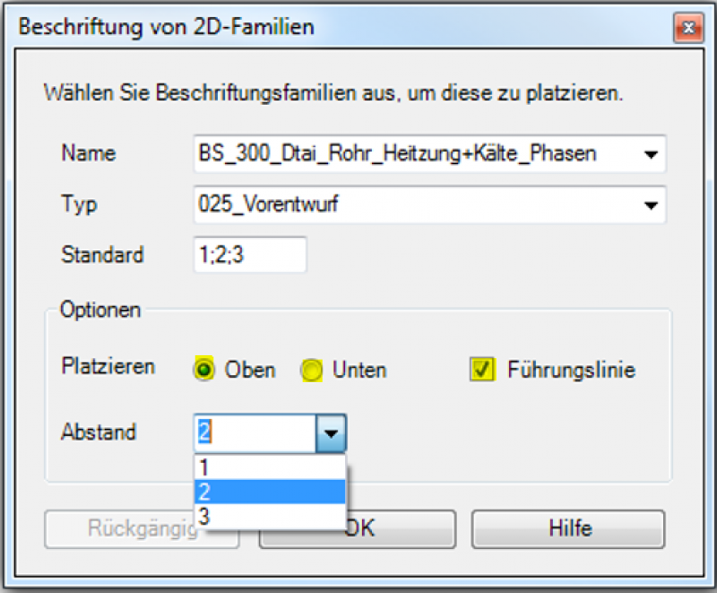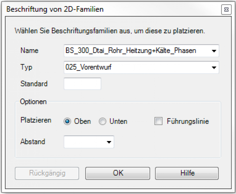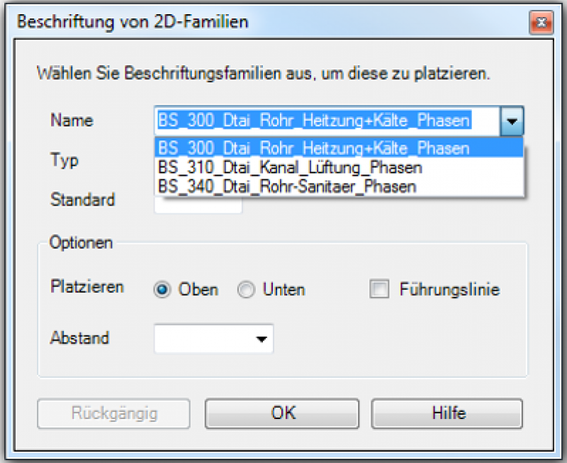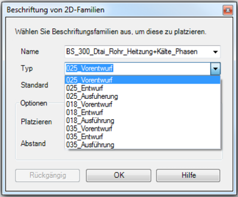 Im Dropdown Typ stehen die in den Beschriftungsfamilien vorhandenen Typen zur Verfügung (Schriftgröße, Phase etc.).