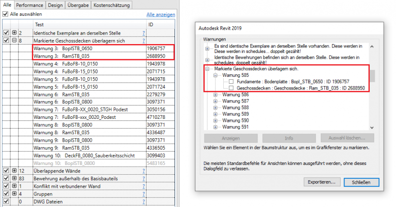 Diese Prüfung basiert auf dem Revit Warnungstyp: Markierte Geschossdecken überlagern sich!