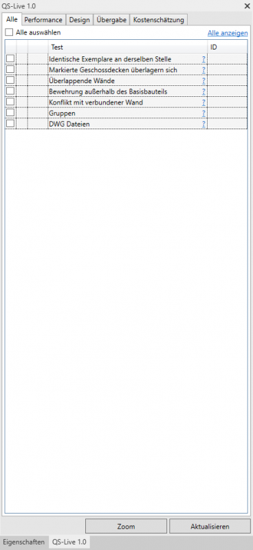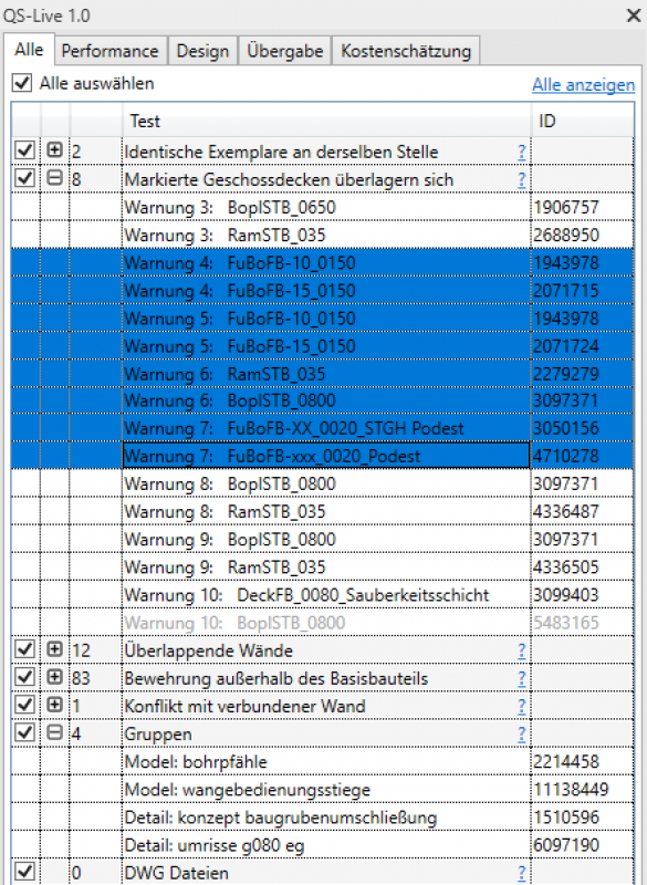 Der User hat die Option, alle Tests durchzuführen oder nur diejenigen, die er auswählt. Selbst bei einer großen Anzahl von Problemen im Modell sammelt das Tool die Informationen rasch.