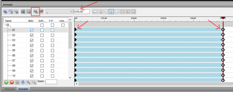- Die Fenster Timeliner, Animator und Auswahlstruktur öffnen.