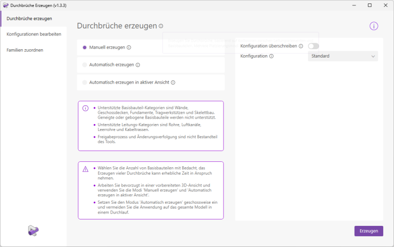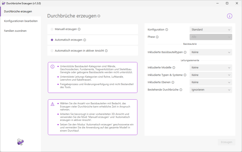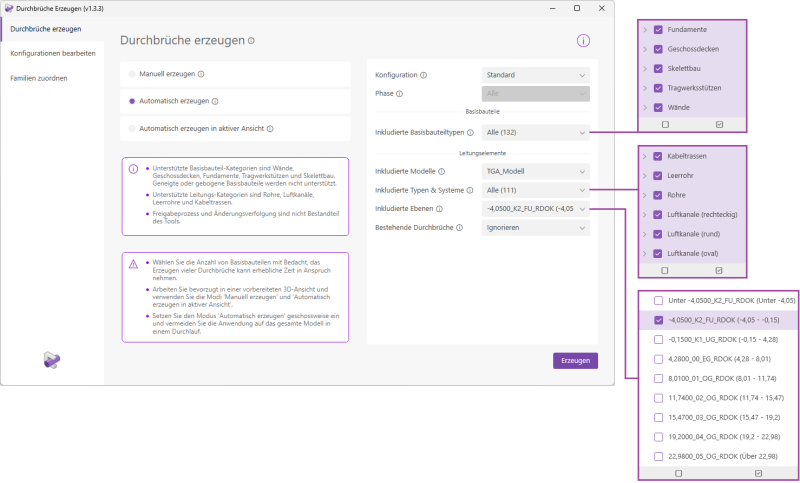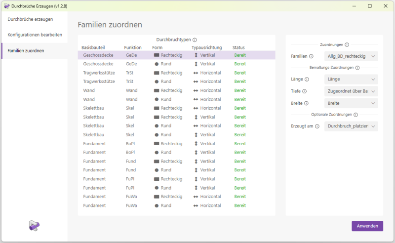 Die Zuordnung der Durchbruchfamilien zu den entsprechenden Basisbauteilen erfolgt vollautomatisch.