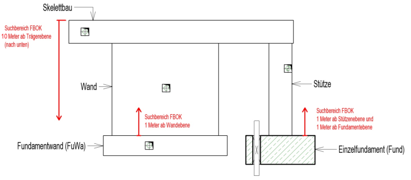 TrSt, Fund, FuWa: Von Basisebene des Basisbauteils wird in einem Bereich von 1,00m aufwärts nach einer Ebene gesucht, die im Namen "FBOK" enthält. Geschossebenen haben dabei Priorität.