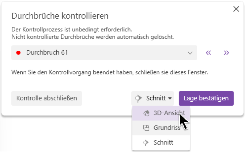 Während dem Kontrollprozess können Sie nach Belieben zwischen 3D- und 2D-Ansichten wechseln. Für Wanddurchbrüche ist der 2D-Modus 'Schnitt' verfügbar. Wir wählen diesen Modus mit Hilfe der Dropdown-Liste.