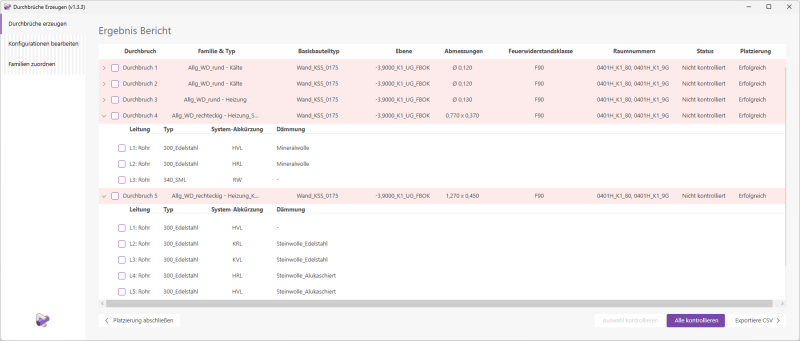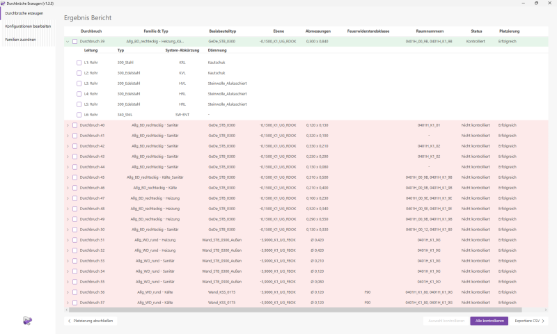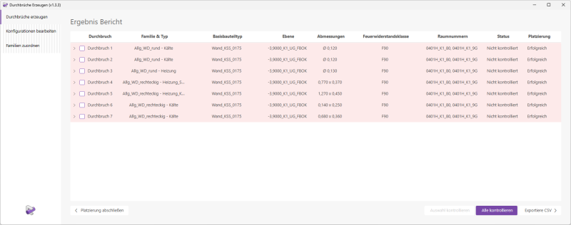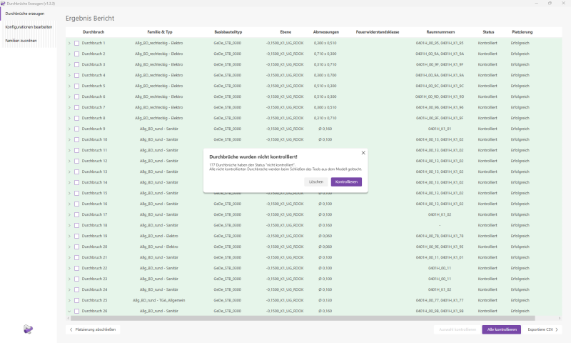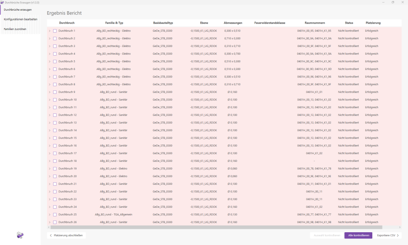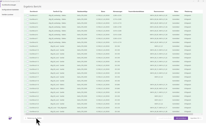 Wir sehen, dass alle Durchbrüche 'Erfolgreich' platziert wurden. Diverse Informationen wie Ebene, Raumnummern und Abmessungen der Durchbrüche werden dargestellt. Bei den Familien und Typen fällt auf, dass sowohl runde als auch rechteckige Durchbrücheplatziert wurden. Das liegt daran, dass einige runde Durchbrüche zu einem rechteckigen Durchbruch zusammengelegt wurden. Die entsprechenden Einstellungen sind in der Konfiguration definiert, welche wir für die Platzierung benutzt haben.