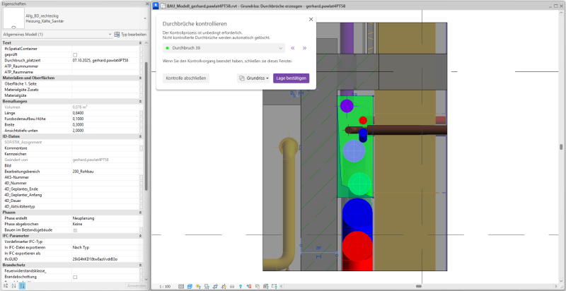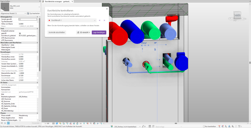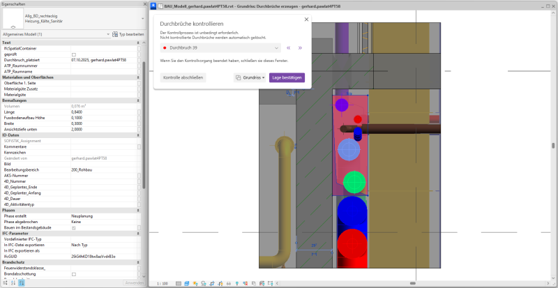 Durchbruch 1 ist in der Ansicht mittig ausgerichtet und rot markiert. Die Farbfüllung entspricht dabei dem Kontrollstatus des Durchbruchs. Der Durchbruch ist bereits ausgewählt, Sie sehen die Parameter des Durchbruchs also direkt im Eigenschaftenfenster. Kontrollieren Sie nun die Lage des Durchbruchs und führen Sie notwendige Anpassungen durch.