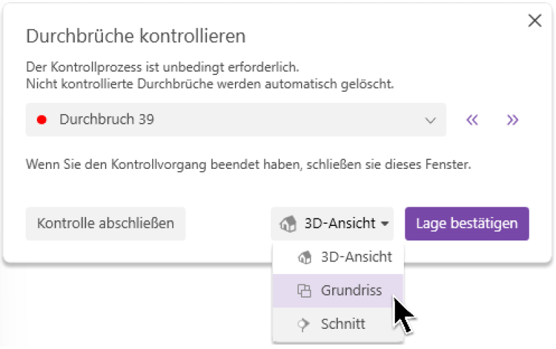 Während dem Kontrollprozess können wir nach Belieben zwischen 3D- und 2D-Ansichten wechseln. Für Bodendurchbrüche ist der 2D-Modus "Grundriss" verfügbar. Wir wählen diesen Modus mit Hilfe der entsprechenden Dropdown-Liste.