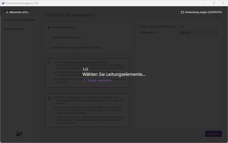 Mit der Schaltfläche 'Durchbrüche Erzeugen' starten wir die entsprechende Revit-Erweiterung.